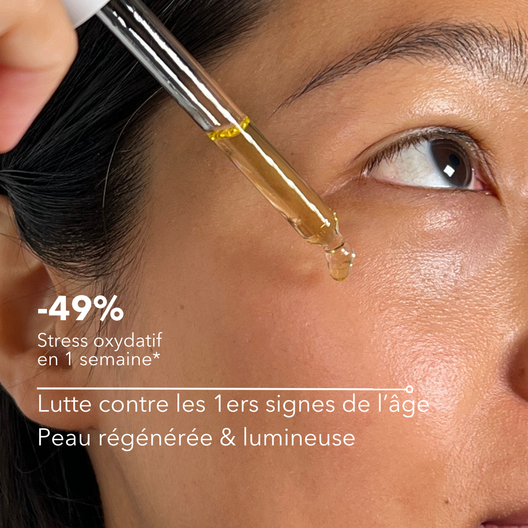 Sur une peau parfaitement démaquillée, nettoyée et tonifiée, j'applique quelques gouttes, du bout des doigts, sur le front et les joues.